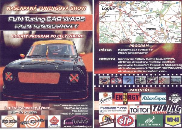 tímto bych Vás chtěl všechny pozvat na další ročník FUN TUNING CAR WARS 2006......termín je 14.-16.7.2006 na letišti Panenský Týnec u Loun...letos bude velká-malá změna oproti minulému ročníku...budeme mít konečně pro sebe CELÉ LETIŠTĚ !!!!...takže sprinty 400m budou probíhat na hlavní přistávací dráze...samozřejmě bude spousta doprovodných akcí... nějaké soutěže v hifi /nějaká EMMA nebo co to je :-))) / ,oblíbená noční gumovačka atd...samo že se Vás budeme snažit bavit až do rána,aby jste neměli čas ani náladu na nějaké blbnutí po pár pivech za volantem...proto upozorňujeme že je domluvená spolupráce s POLICII ČR na namátkové kontroly na alkohol za volantem...budeme se snažit co nejtvrději postupovat proti takovým debilům jako se vyskytují v Hradci a spol. aby jste si to mohli užít v klídku a v pohodě....průběžně budu doplnovat různé informace....cokoliv kdokoliv se chcete zeptat,nějaký podmět na zlepšení i kritiku můžete sem nebo přímo na mě..email,ICQ....díkes David